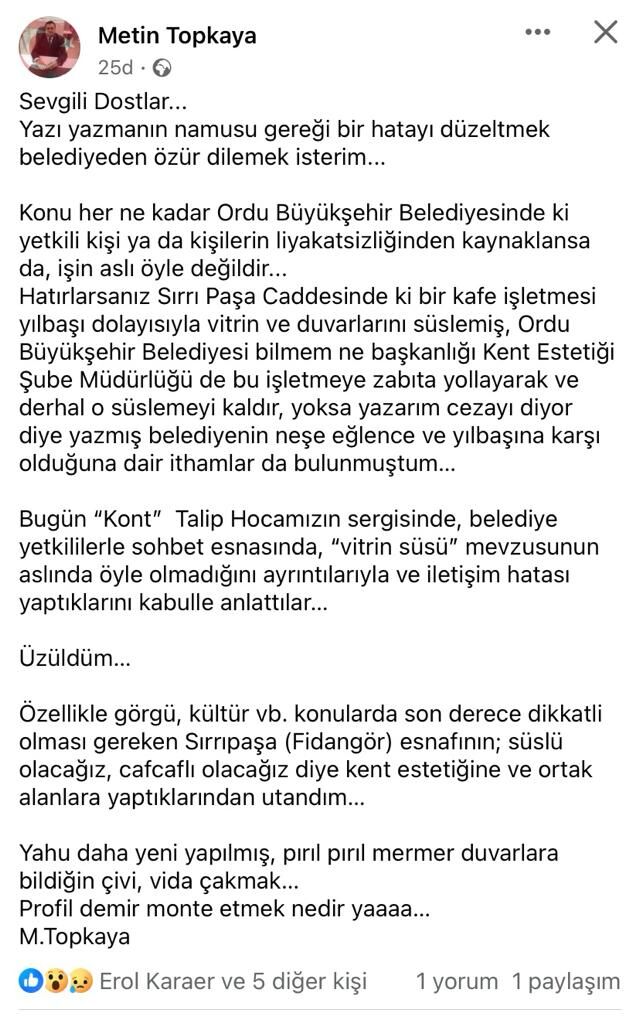 Geçtiğimiz günlerde Ordu Büyükşehir Belediyesi tarafından Altınordu Sırrı Paşa’da yeni yıl süslemesi yapan esnafa ceza yazıldığı haberleri dezenformasyon çıktı. Kartvizitlerinde ‘gazeteci’ yazanların ortaya attığı iddiaların perde arkası, gazetecilik mesleğinden gelmeyen ve Hava Kuvvetleri Komutanlığı’ndan emekli köşe yazarı Metin Topkaya’nın yazısıyla ortaya çıktı.